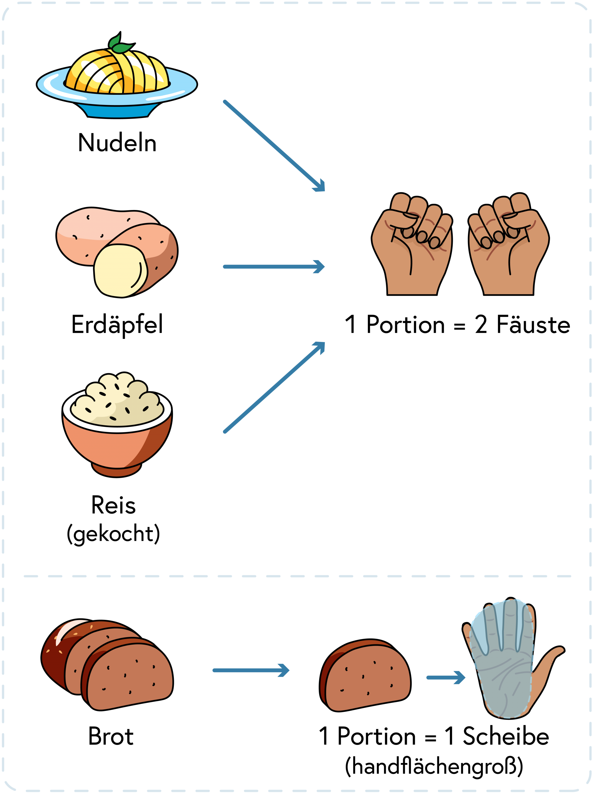 Wählen Sie dabei aus der Vielfalt an Getreidesorten und bevorzugen Sie die Vollkornvariante. 1 Portion Brot entspricht einer Handfläche, 1 Portion Erdäpfel, Nudeln oder Reis (gekocht) entspricht der Menge von 2 Fäusten.