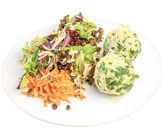 Für den Salat Karotten waschen, grob reiben und mit dem gewaschenen Pflücksalat in eine Schüssel geben. Mit Essig, Öl und Salz marinieren und mit Kürbiskernen und Schnittlauchröllchen bestreuen. Die Knödel mit geriebenem Bergkäse garnieren und mit Salat servieren.
